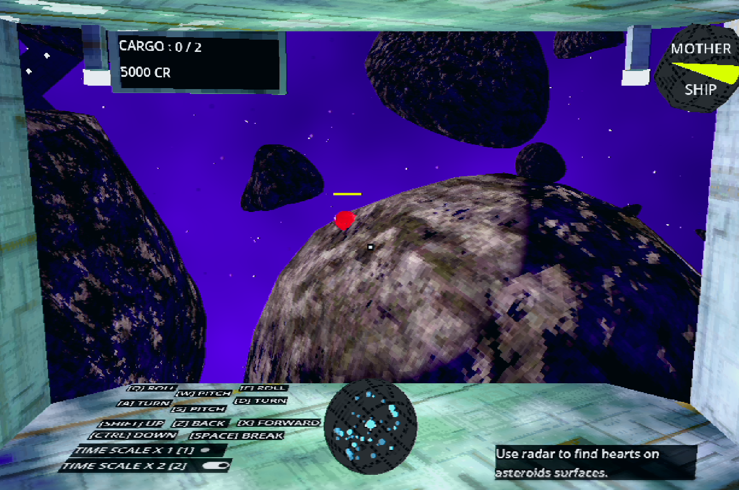Pilot your spaceship and mine space hearts. Obtain monies and buy upgrades and AI Miners who will also mine hearts and give more monies.